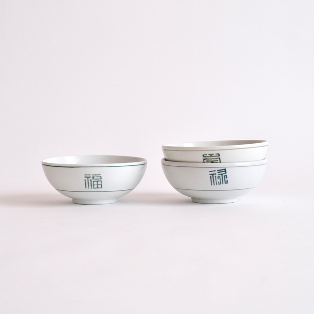 一般の家庭で汁椀として日常的に使われていた器 日本でいうと昭和初期ぐらい、少し前の年代のものです。 白磁に緑色で福・禄・壽の縁起の良い文字が押されています。 深いタイプのものと浅いタイプのものがあり、こちらは浅いものです。 size それぞれ直径 約15.5cm、深さ 約5cm 約430〜470g 同じ時代の器ですが、白磁と文字の色味に若干の差異があります。 商品は全てきれいにケアをしてから撮影、発送をしておりますが、経年による使用感や画像には映し出せない細かな傷や少々の歪みなどもあります。 古いものの味わいとしてご理解いただき、お求めいただけましたら幸いです。