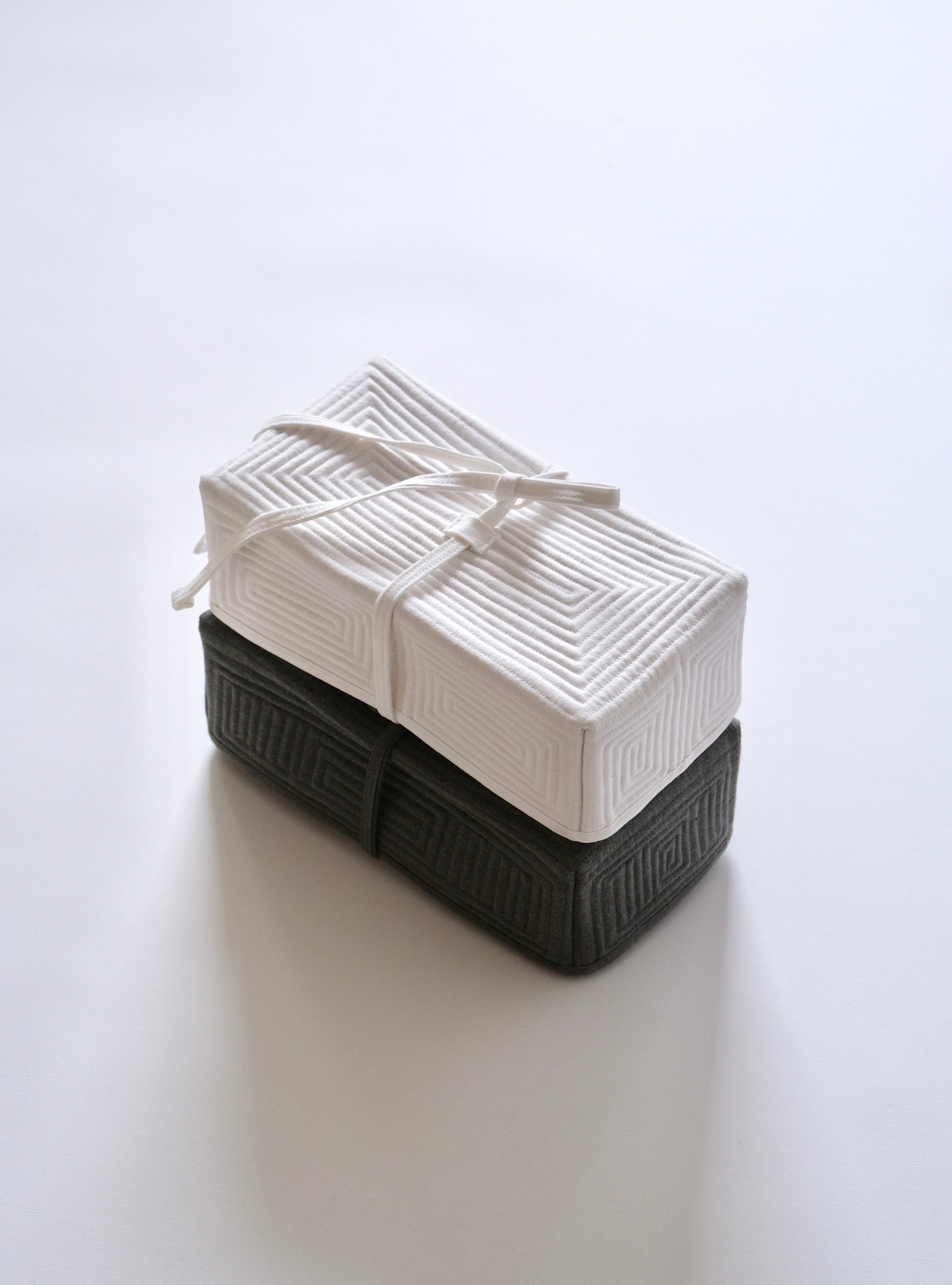 肌にまとう衣類やイブルには、保温性を高めるために生地と生地の間に綿を挟みヌビを施すものが多く見られ、チュモニ(巾着)などの小物類には、紙をこより状にしたものや細い木綿の紐を挟み、より細やかな線でヌビを表現したものがあります。