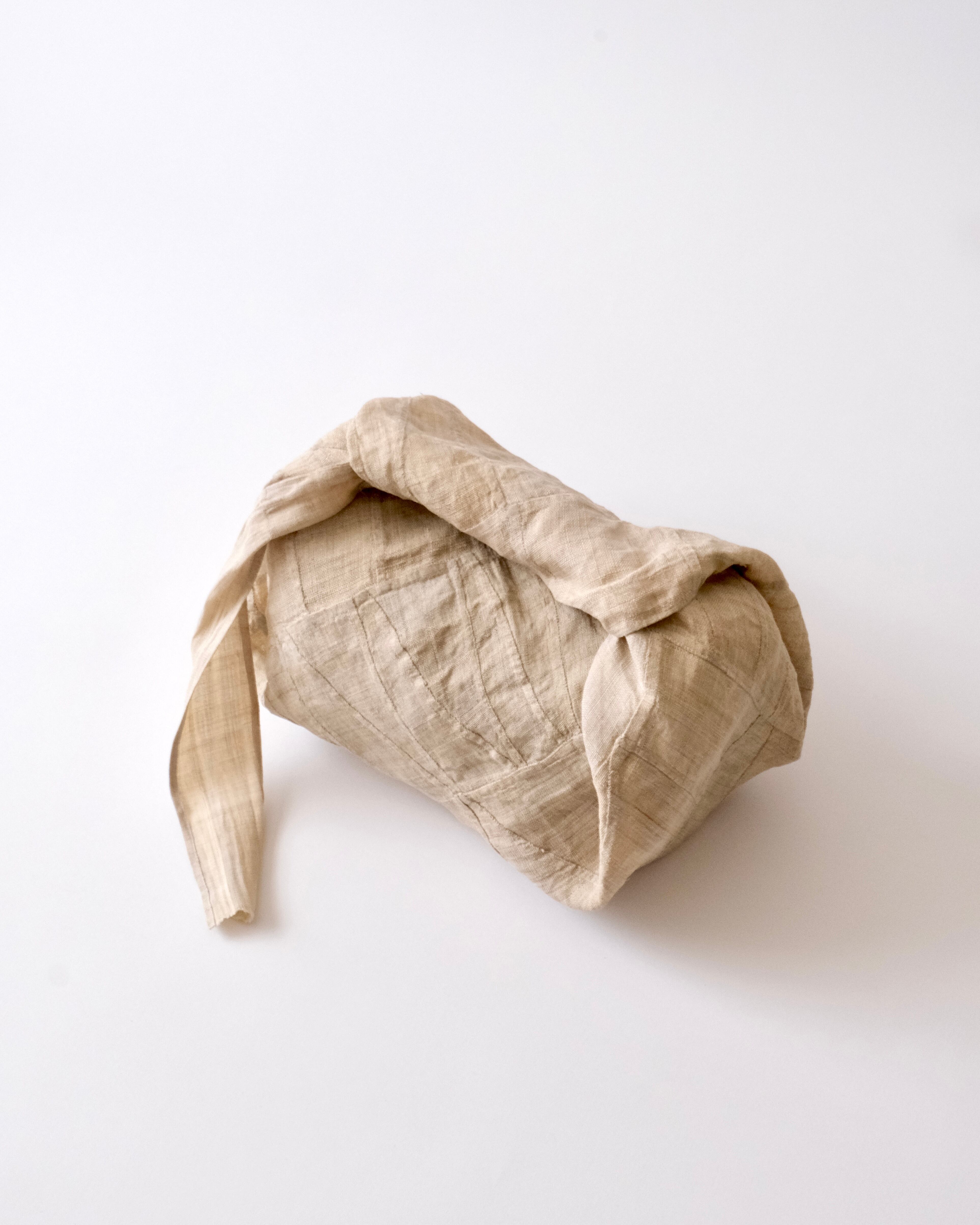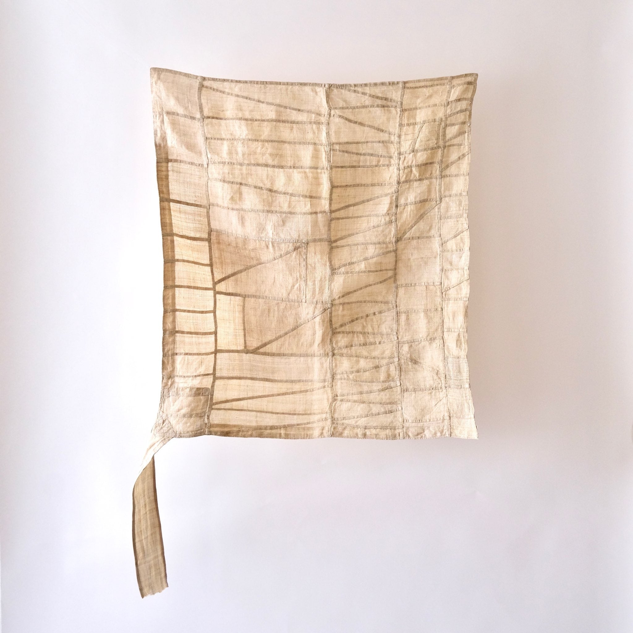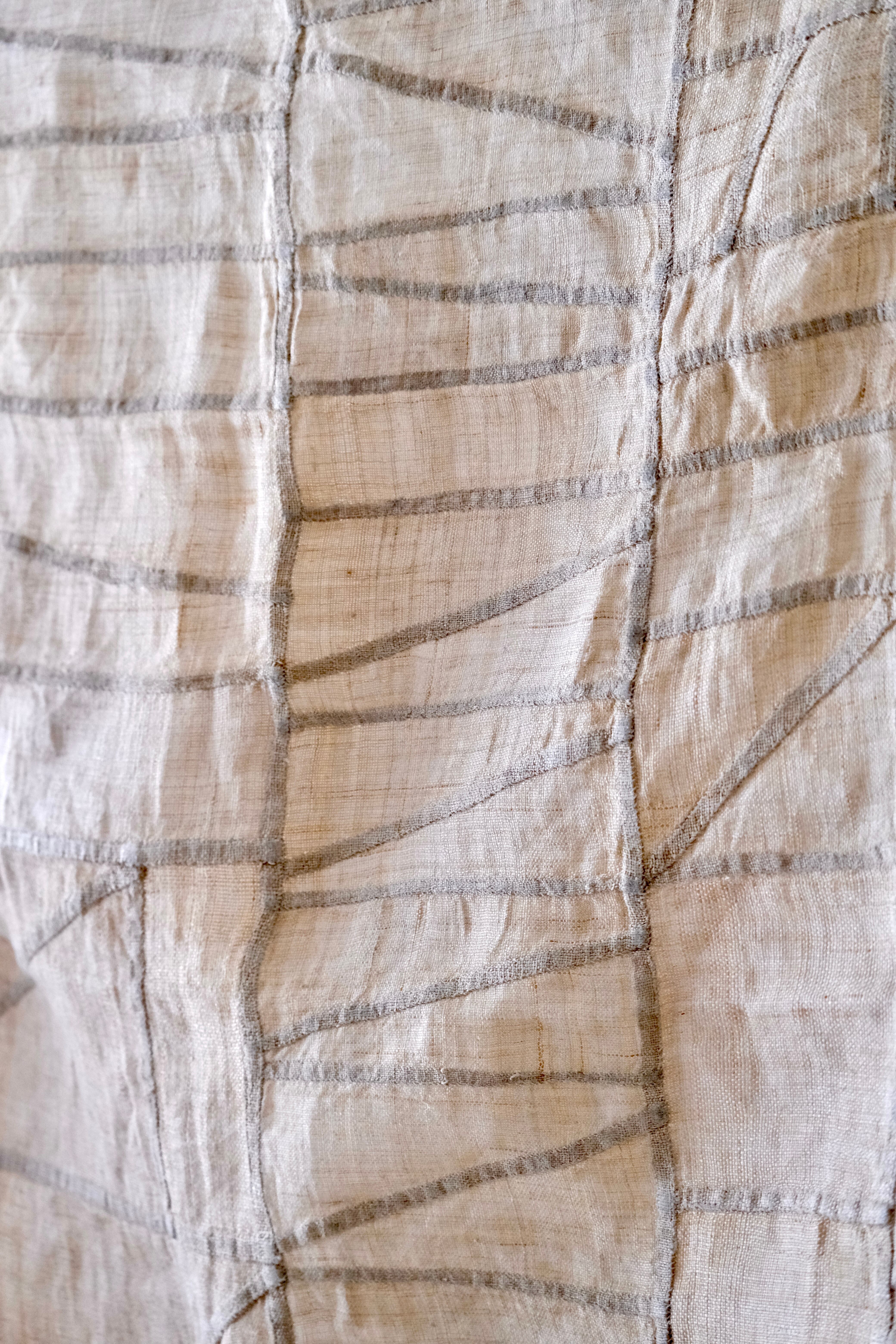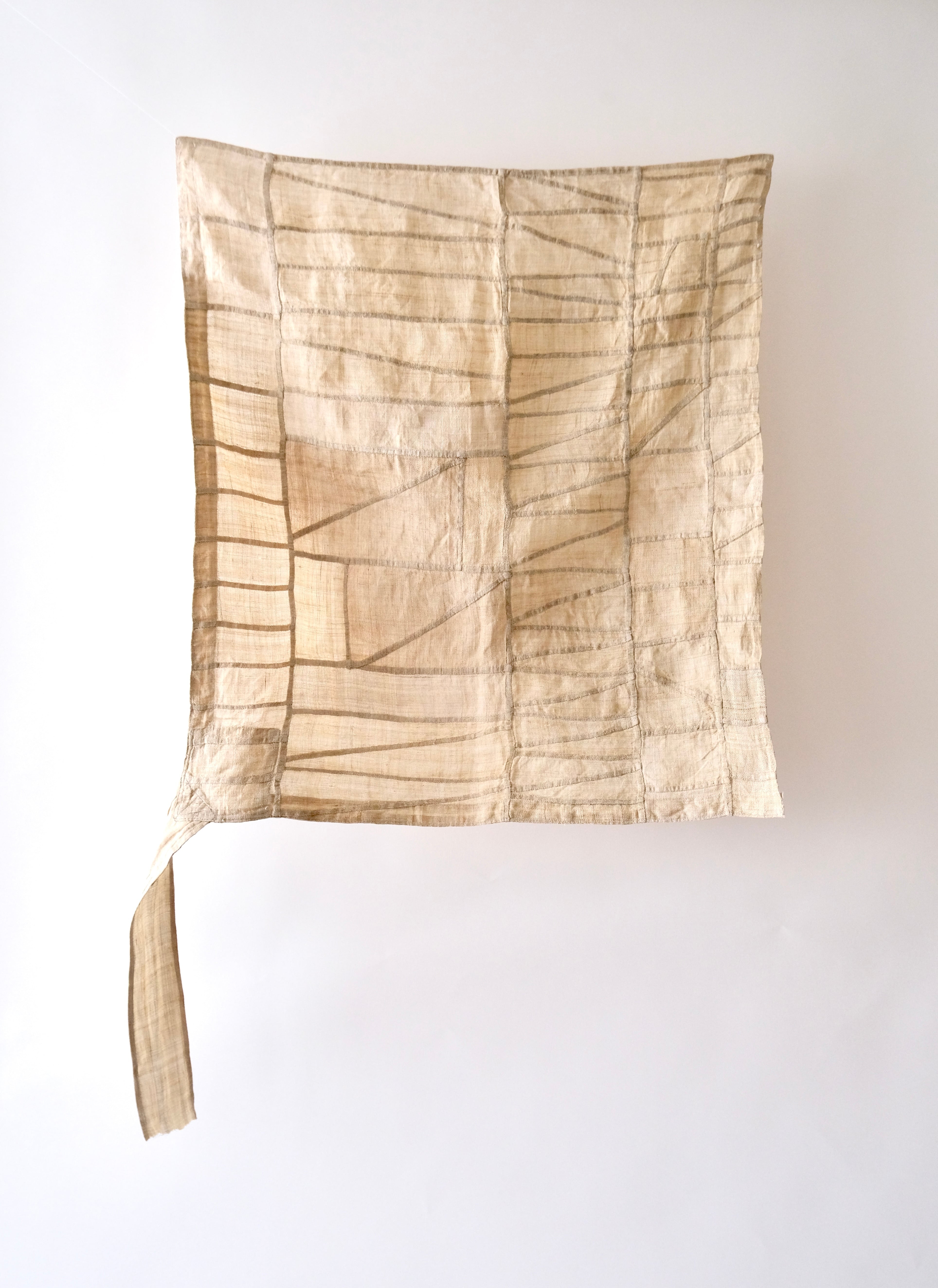 手縫いですが、ふたつの縁に当て布で補強がしてあり、この部分と紐にミシンのステッチが見られます。