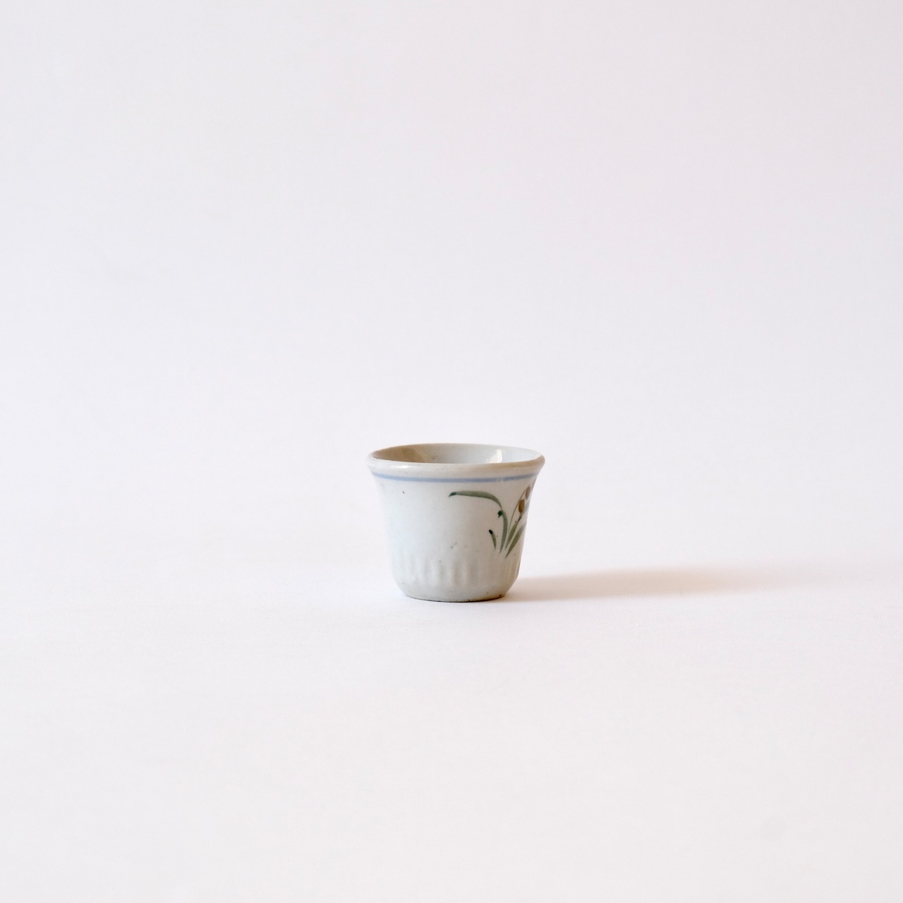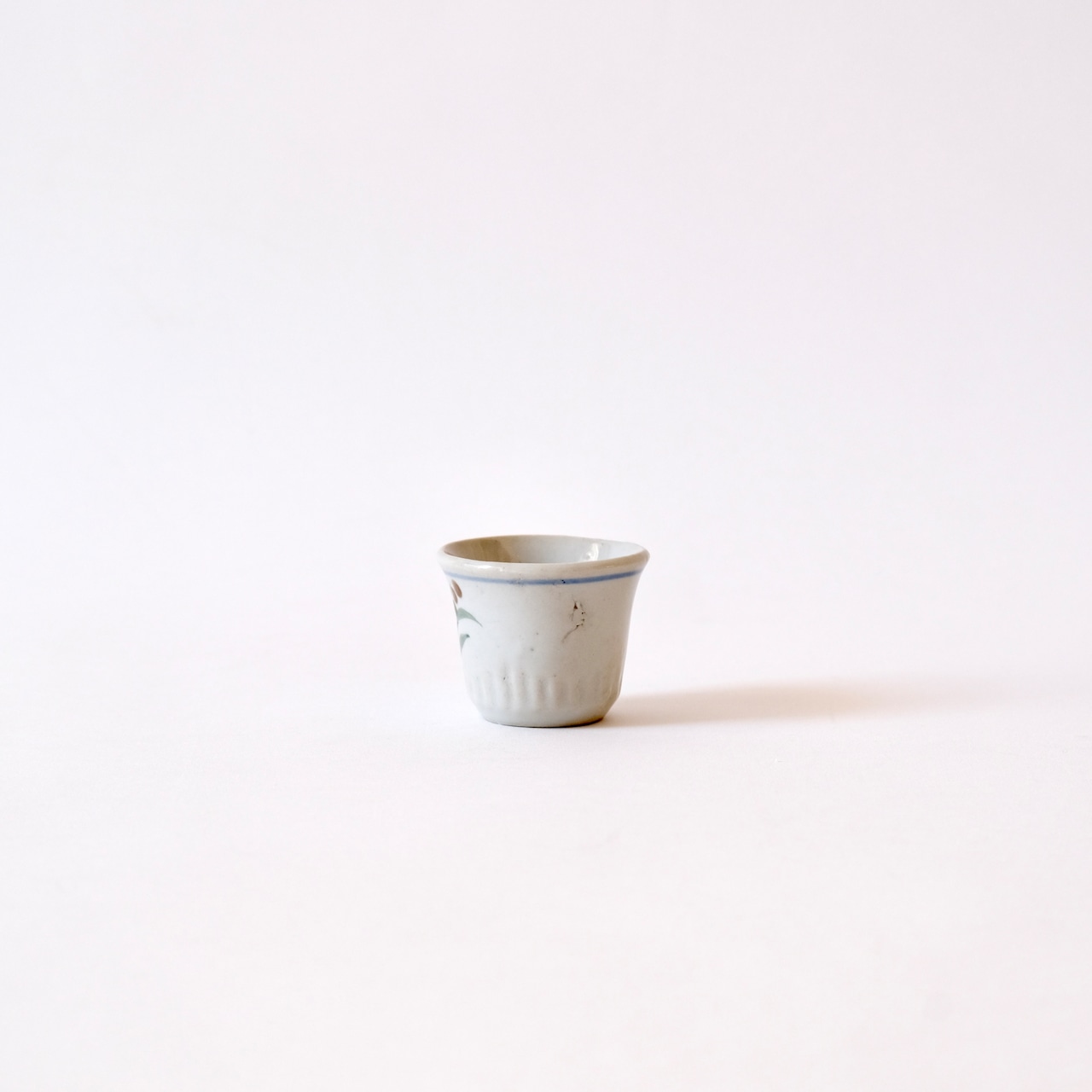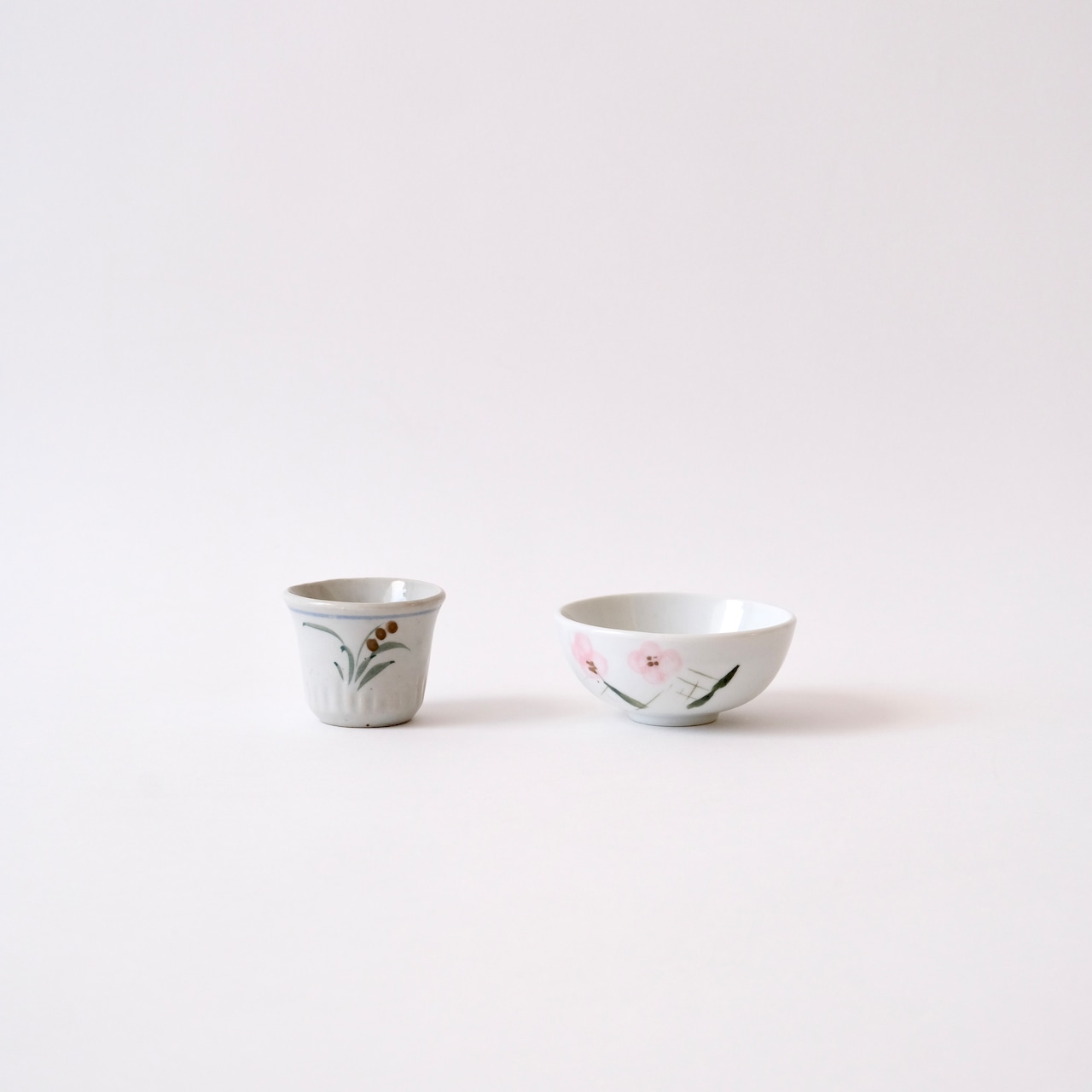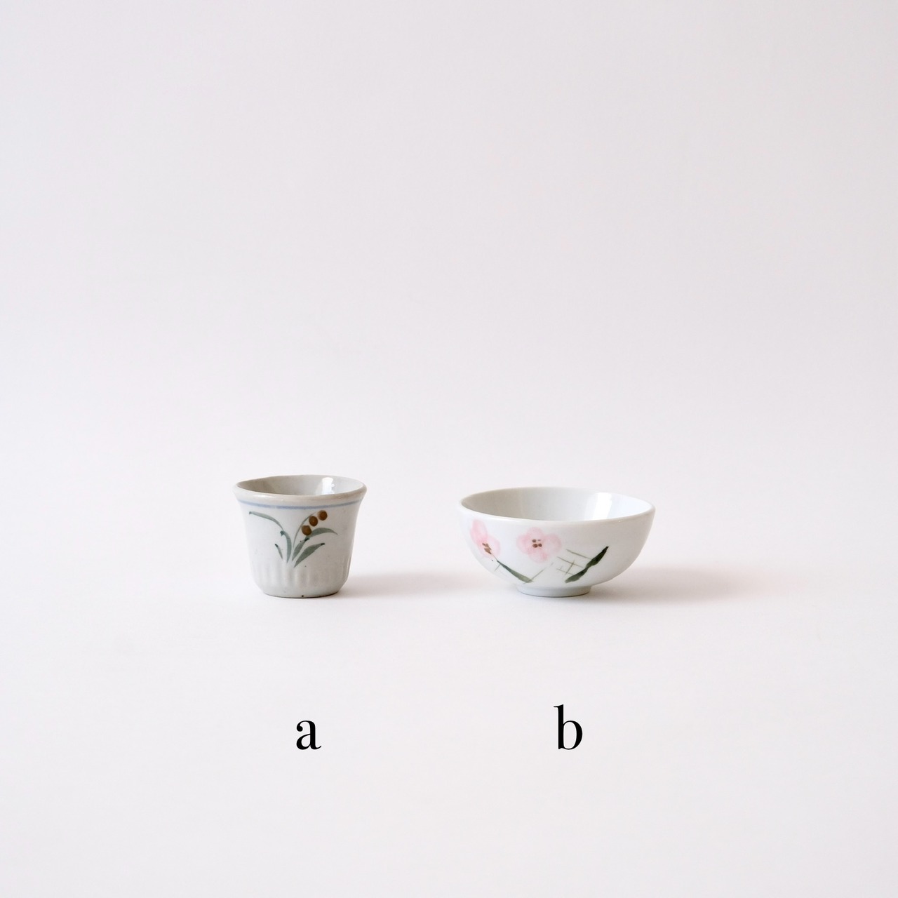 aはやや灰白色で花にブルーのラインの入ったお猪口型、bは梅花の絵付がかわいらしい茶杯です。
