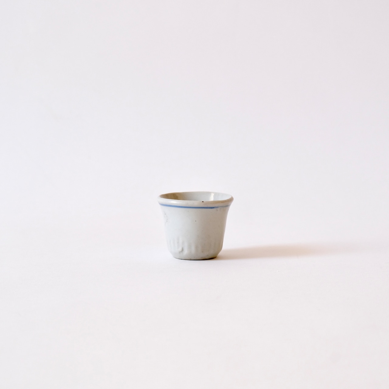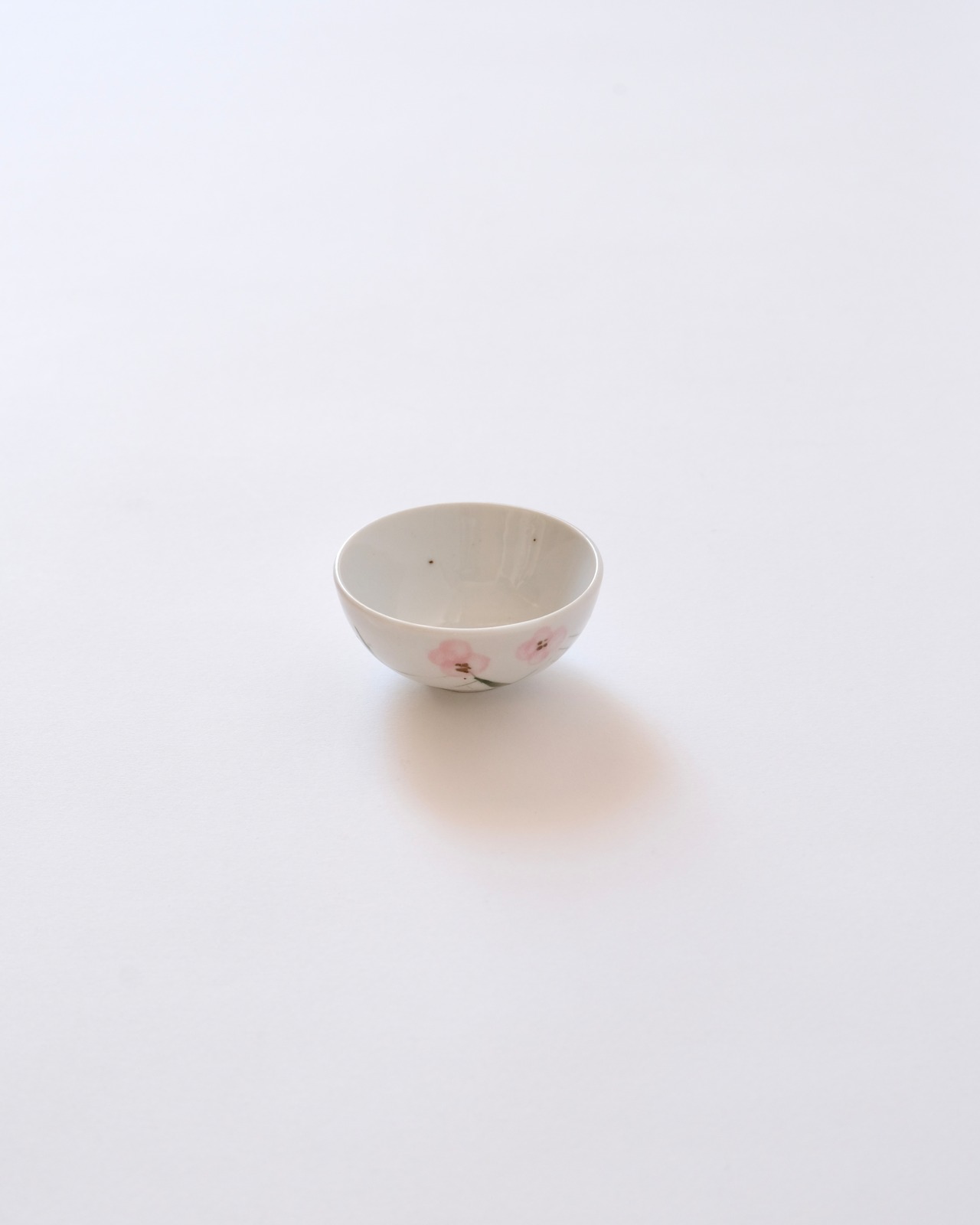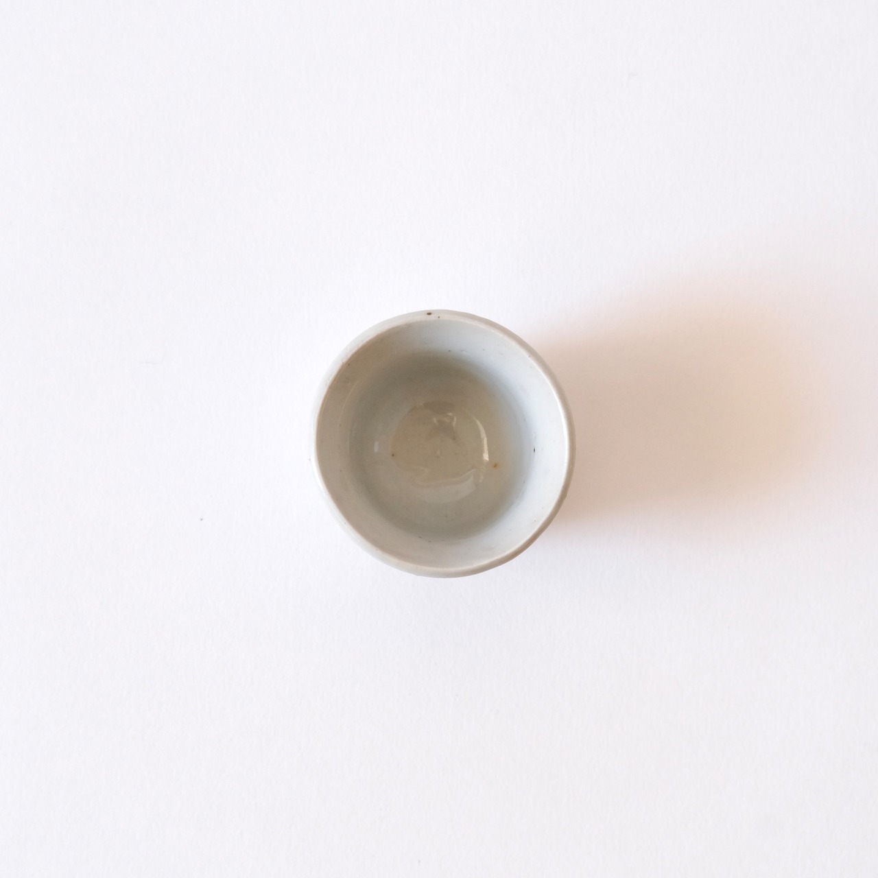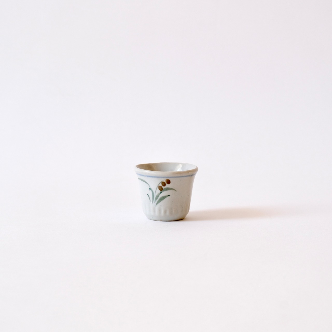 aはやや灰白色で花にブルーのラインの入ったお猪口型、bは梅花の絵付がかわいらしい茶杯です。